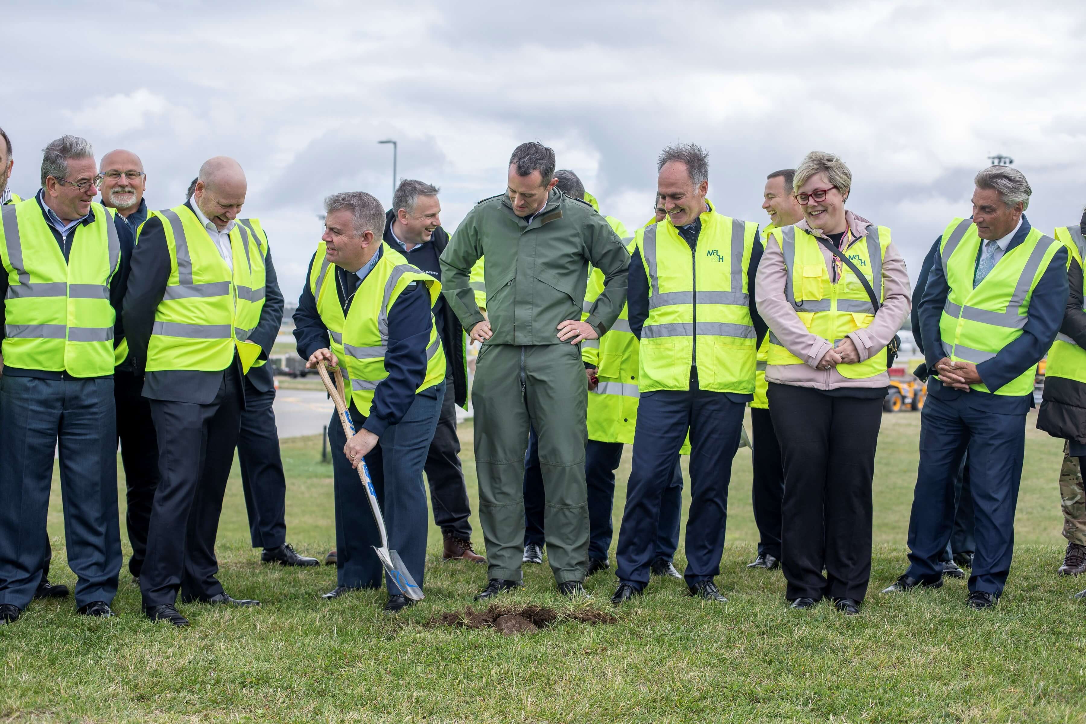 The ceremony to prepare the ground was undertaken by Air Commodore Alex Hicks who was joined by Wing Commander Andy Knight and Chris Laslett of Defence Equipment and Support (DE&S), Mr Ian Vett from Boeing Defence UK, and Mr Paul Griffen from infrastructure contractor McLaughlin & Harvey.